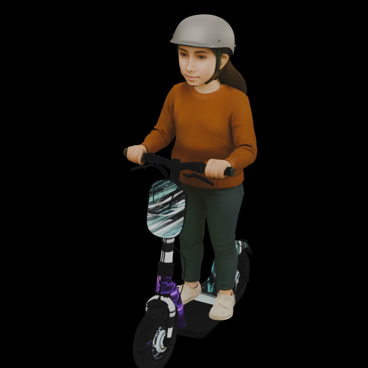 Capture the essence of modern, eco-friendly commuting with this female character riding an electric scooter. Wearing a helmet, orange sweater, green pants, and sneakers, she exudes casual, urban mobility. This model is ideal for illustrating city travel routes, tech-savvy transportation, or modern commuting in urban environments. Whether navigating busy streets or cruising through green zones, this E-Scooter model adds both realism and functionality to your Travel Animator projects. Optimized for performance, it ensures smooth rendering and clear detailing, making it the perfect addition for animated city paths, innovative travel stories, and everyday city life.