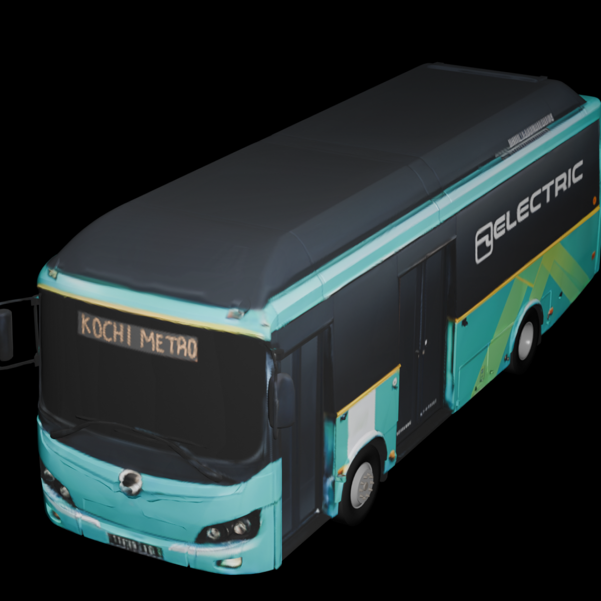 A modern electric feeder bus designed for short urban routes and last-mile connectivity. The vehicle has a compact single-deck body with a rounded front and large panoramic windshield that provides clear visibility for the driver. Its exterior features a turquoise and black color scheme with geometric green accents along the sides, giving it a contemporary transit look.