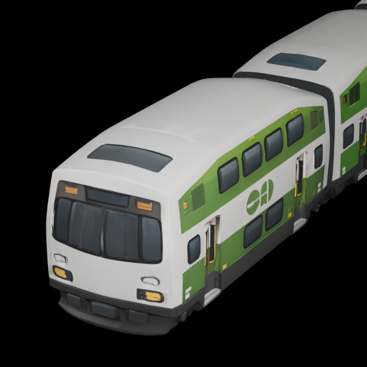 A double-deck commuter train designed for high-capacity regional rail transport. The train has a long, rectangular body with two levels of passenger windows running along the sides. The front cab car has a rounded nose with a wide, curved windshield and small rectangular headlights positioned near the corners of the front panel.