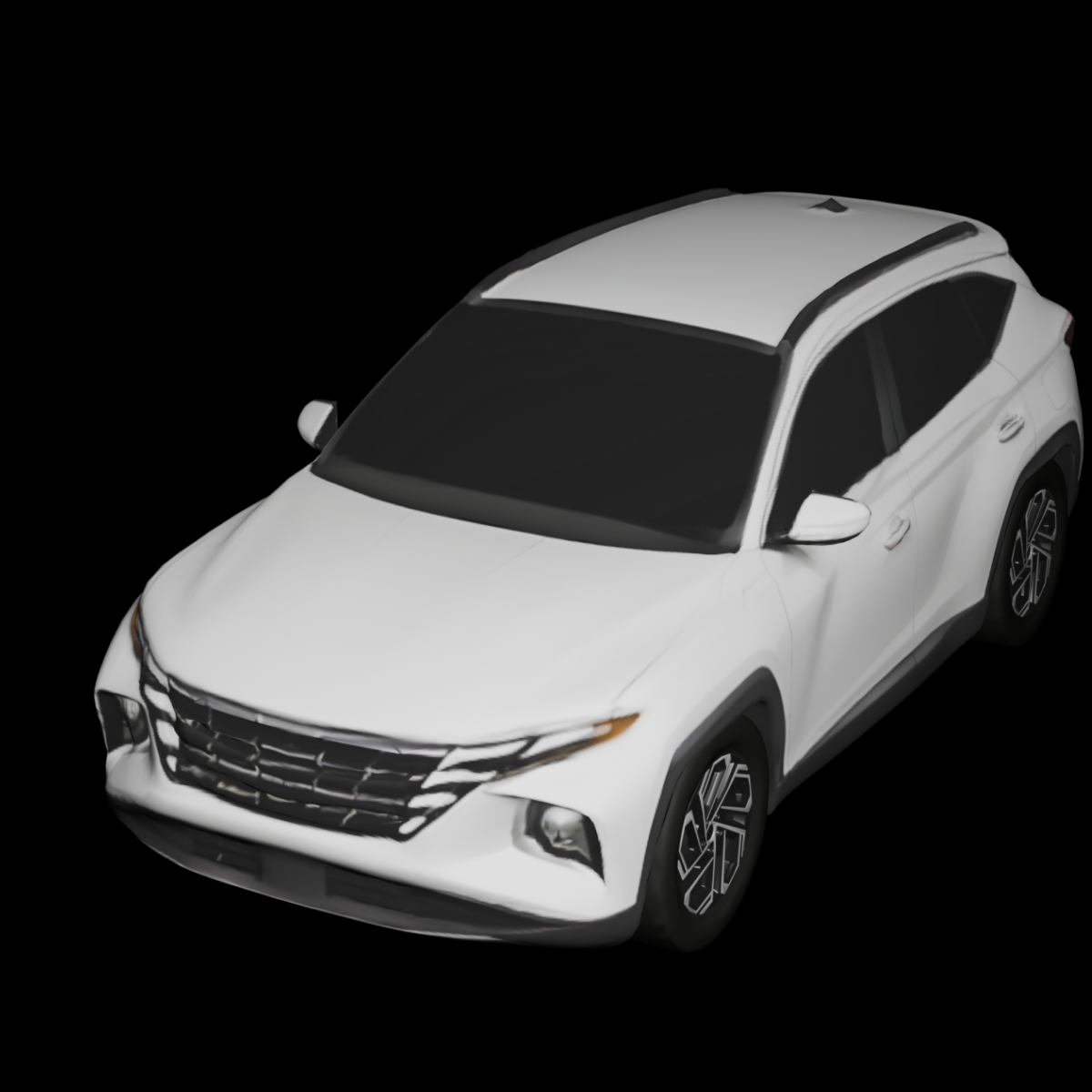 A modern compact SUV with a bold geometric front grille, sharp integrated LED headlights, sculpted body panels, high ground clearance, slightly sloping roofline with roof rails, and clean simplified geometry with dark non-transparent windows and detailed alloy wheels.