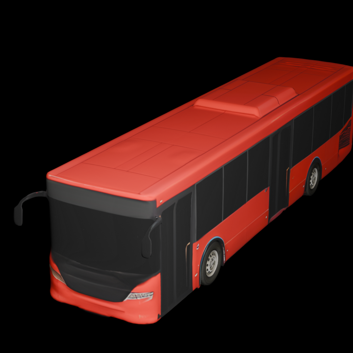 A modern city transit bus with a long rectangular low-floor body, wide curved front windshield, slim integrated headlights, large continuous dark passenger window band, centrally positioned entry doors, smooth side panels with minimal detailing, slightly raised roof equipment housing, and clean simplified geometry with large wheels and an urban functional design.
