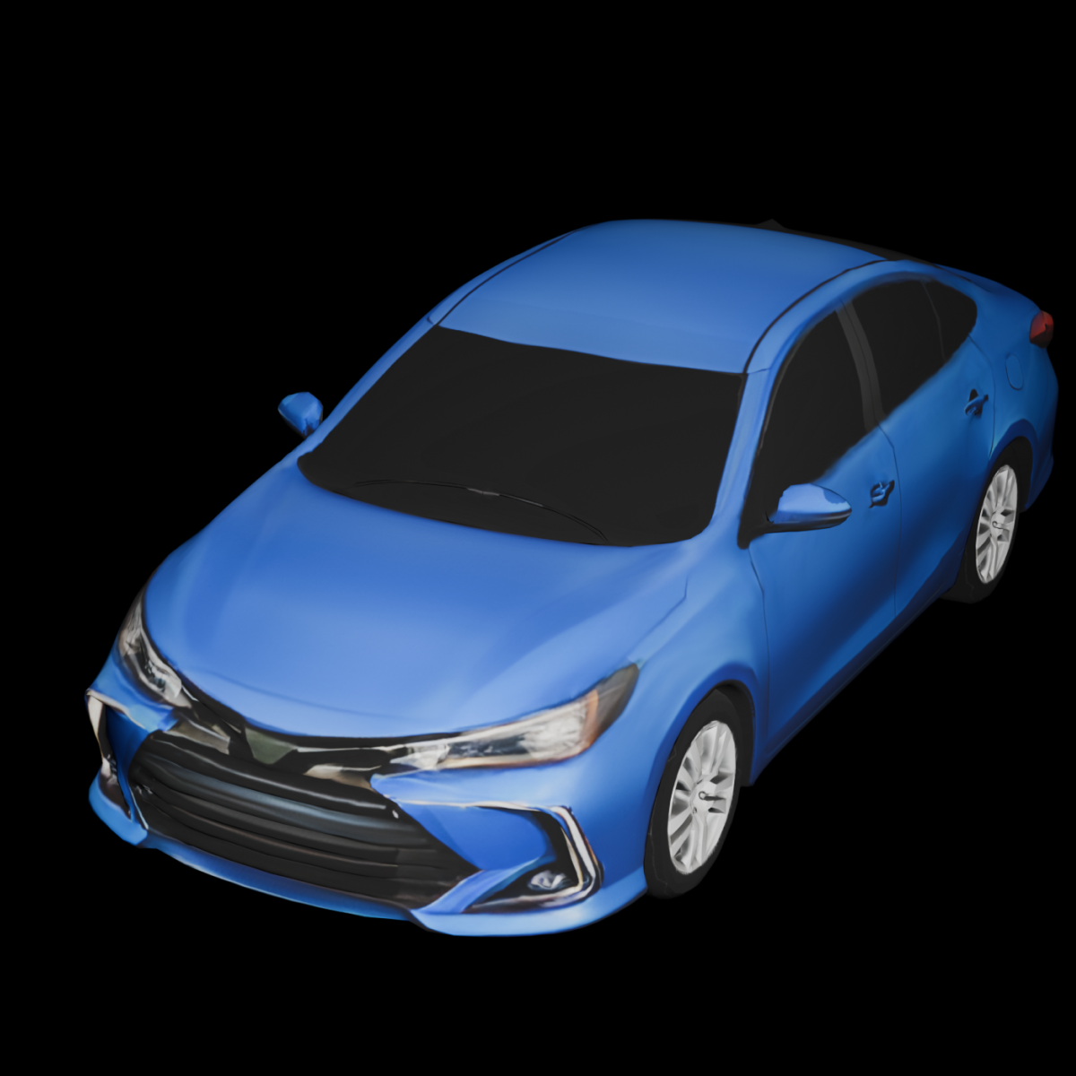 A compact sedan with a modern aerodynamic profile, wide layered front grille, sharp swept-back headlights, sculpted bumper with vertical accent elements, smooth body panels, gently sloping roofline, short rear deck, and clean simplified geometry with dark non-transparent windows and practical alloy wheels.