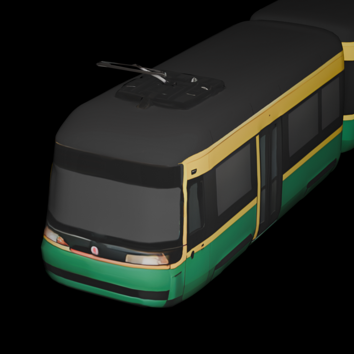 A modern articulated tram with a sleek rounded front cab, large curved windshield, multiple connected low-floor sections, wide sliding doors, continuous dark window band, roof-mounted pantograph and equipment units, and clean simplified geometry with a smooth urban light-rail design.