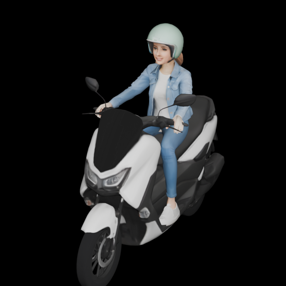 A modern maxi-scooter with a sleek aerodynamic body, sharp front fairing with integrated LED-style headlights, step-through frame, wide footboard, long comfortable seat, and a rider in an upright relaxed posture, featuring clean simplified geometry and dark non-transparent surfaces.