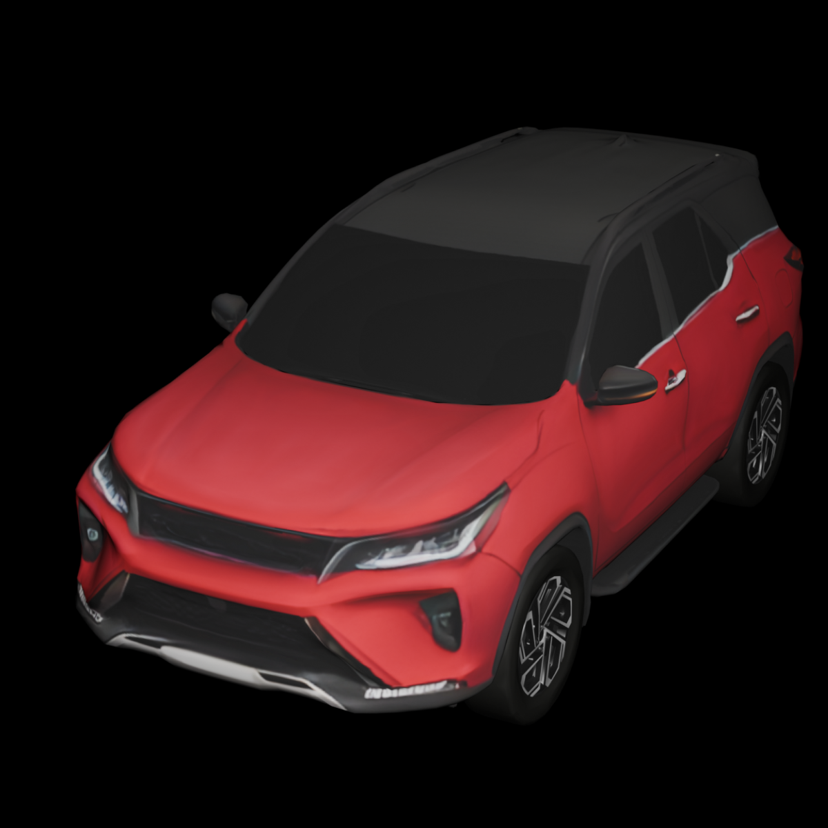 A large rugged SUV with a bold high-riding stance, wide grille integrated with slim LED headlights, sculpted hood lines, muscular body panels, high ground clearance, pronounced wheel arches, roof rails, and clean simplified geometry with dark non-transparent windows and durable alloy wheels.