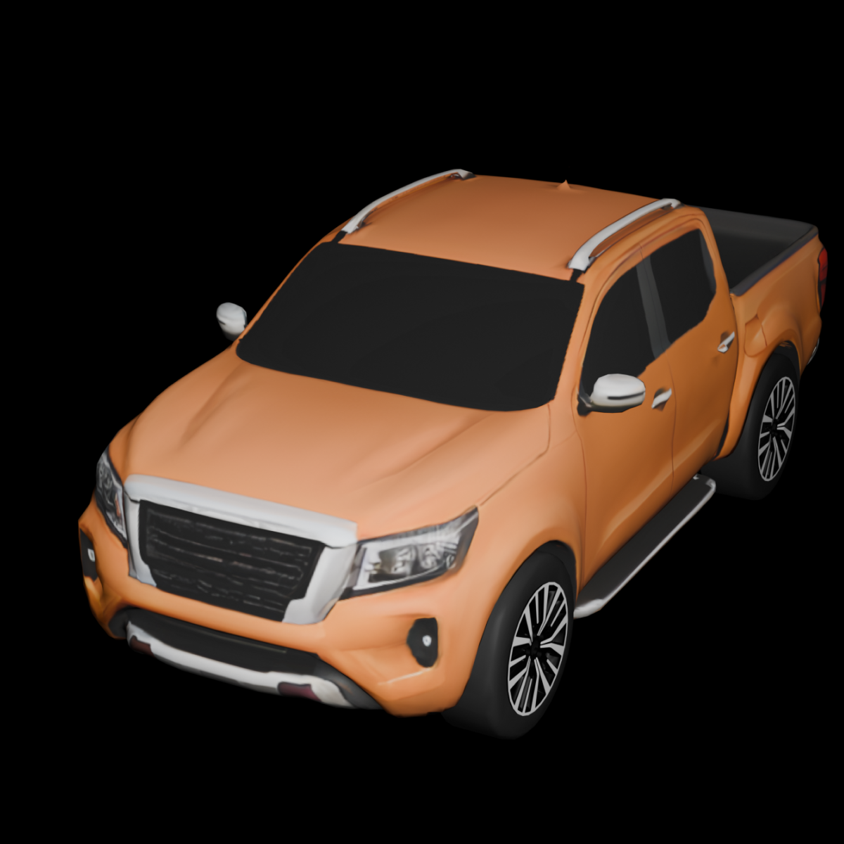 A rugged midsize pickup truck with a bold upright front grille, angular headlights, muscular hood contours, high ground clearance, double-cab layout, open cargo bed, pronounced wheel arches, roof rails, and clean simplified geometry with dark non-transparent windows and sturdy alloy wheels.