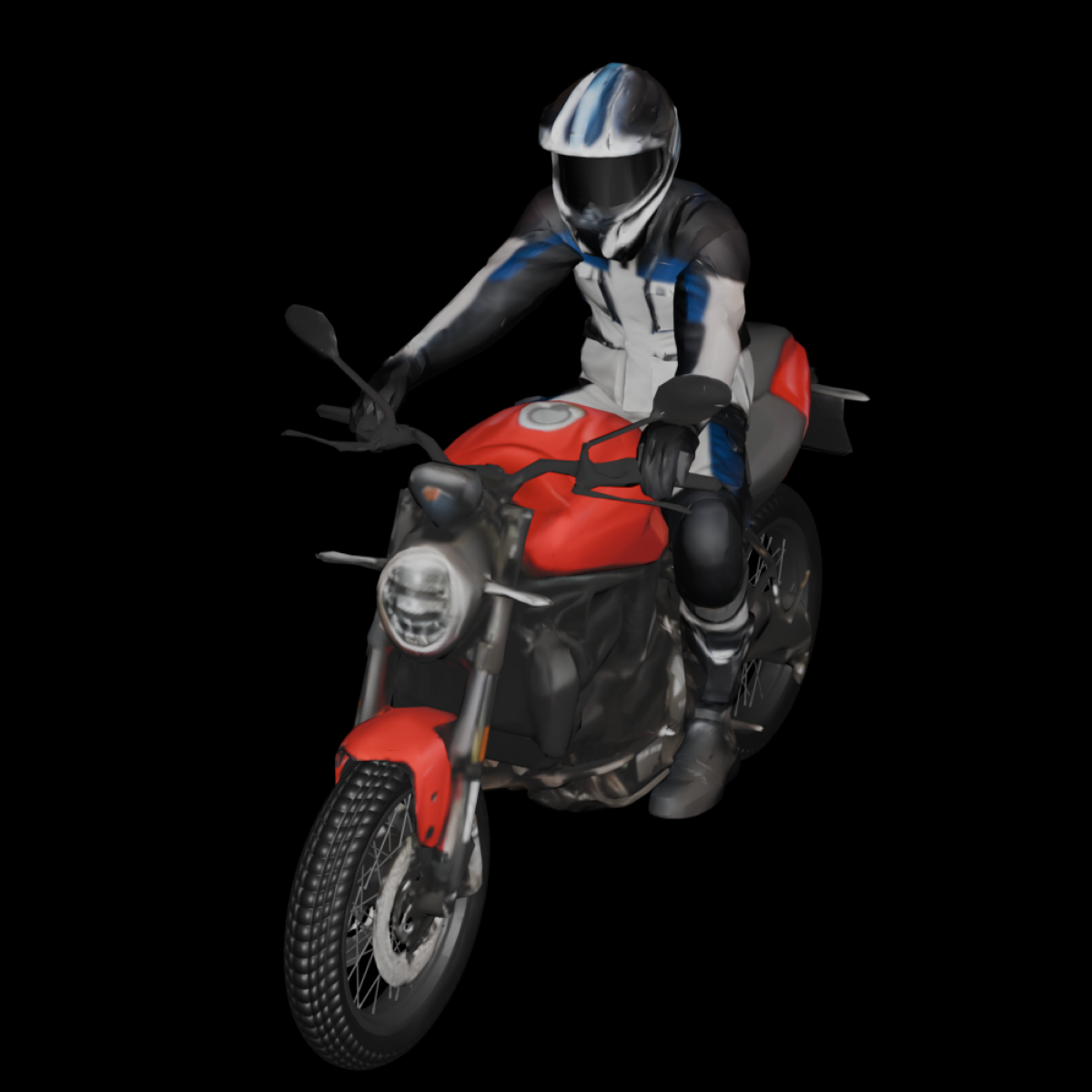 A naked sport motorcycle with a muscular exposed frame, sculpted fuel tank, round headlight, compact tail section, and a rider in a forward-leaning posture, featuring clean simplified geometry, dark non-transparent surfaces, and bold contrasting color accents.