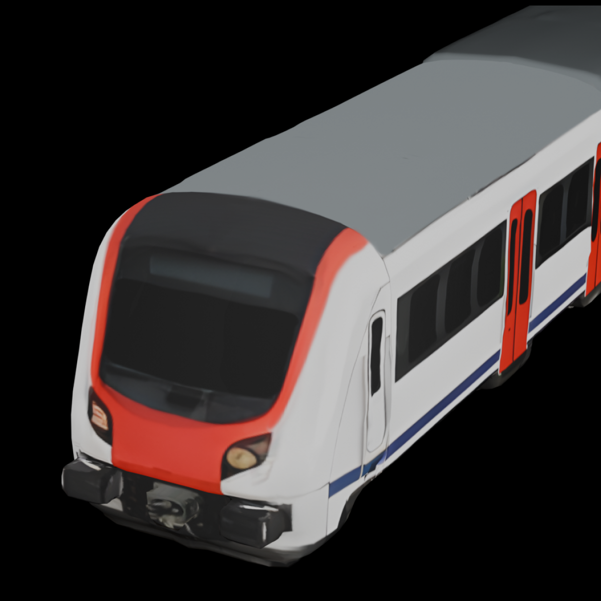 A modern electric multiple unit train with a streamlined rounded cab front, large curved windshield, smooth aerodynamic body, evenly spaced passenger windows, centrally positioned sliding doors, articulated carriage sections, roof-mounted equipment modules, and clean simplified geometry with dark non-transparent windows and a sleek commuter rail design.